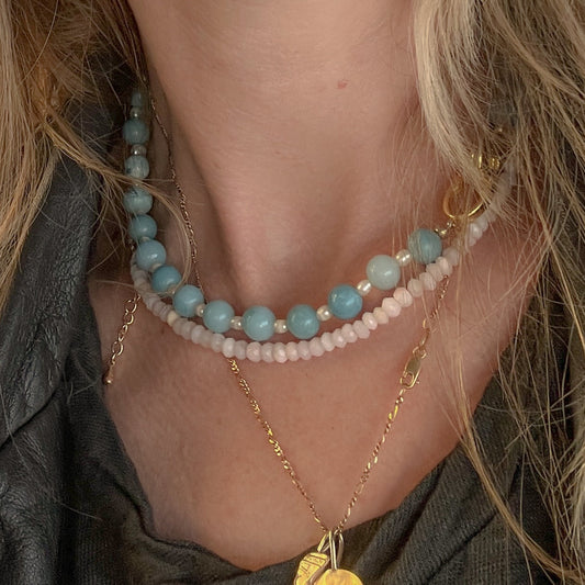 Discover the soothing energy of aquamarine, larimar, jade, howlite and moonstone, helping to ease anxiety and promote restful sleep. Pieces designed to instil a sense of peace wherever you go.
