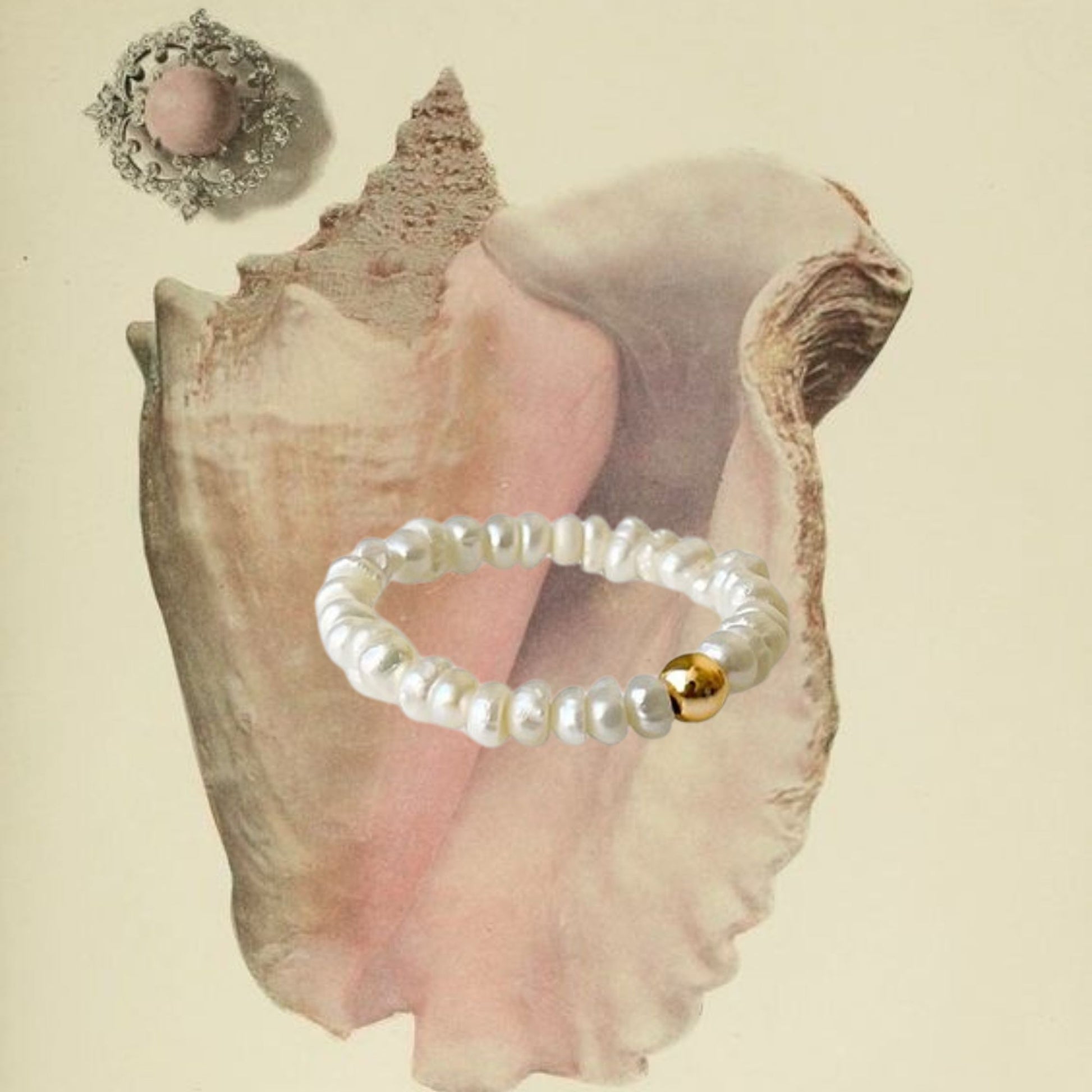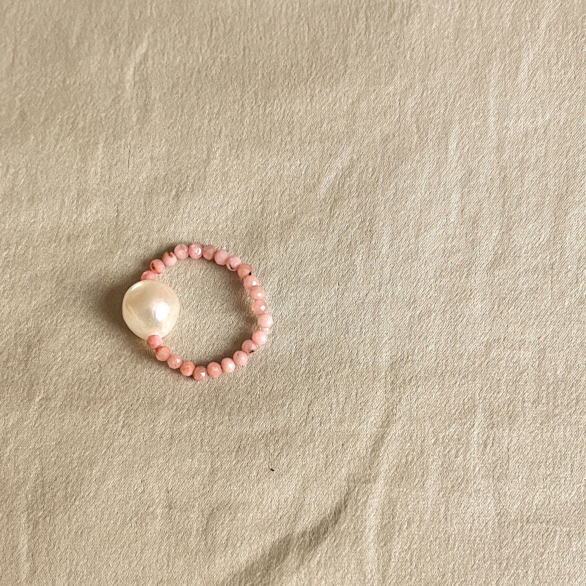 This adjustable elastic ring is strung with tiny beads — available in freshwater pearl, pink opal or a soft multigem mix — and made to be worn alone or stacked.