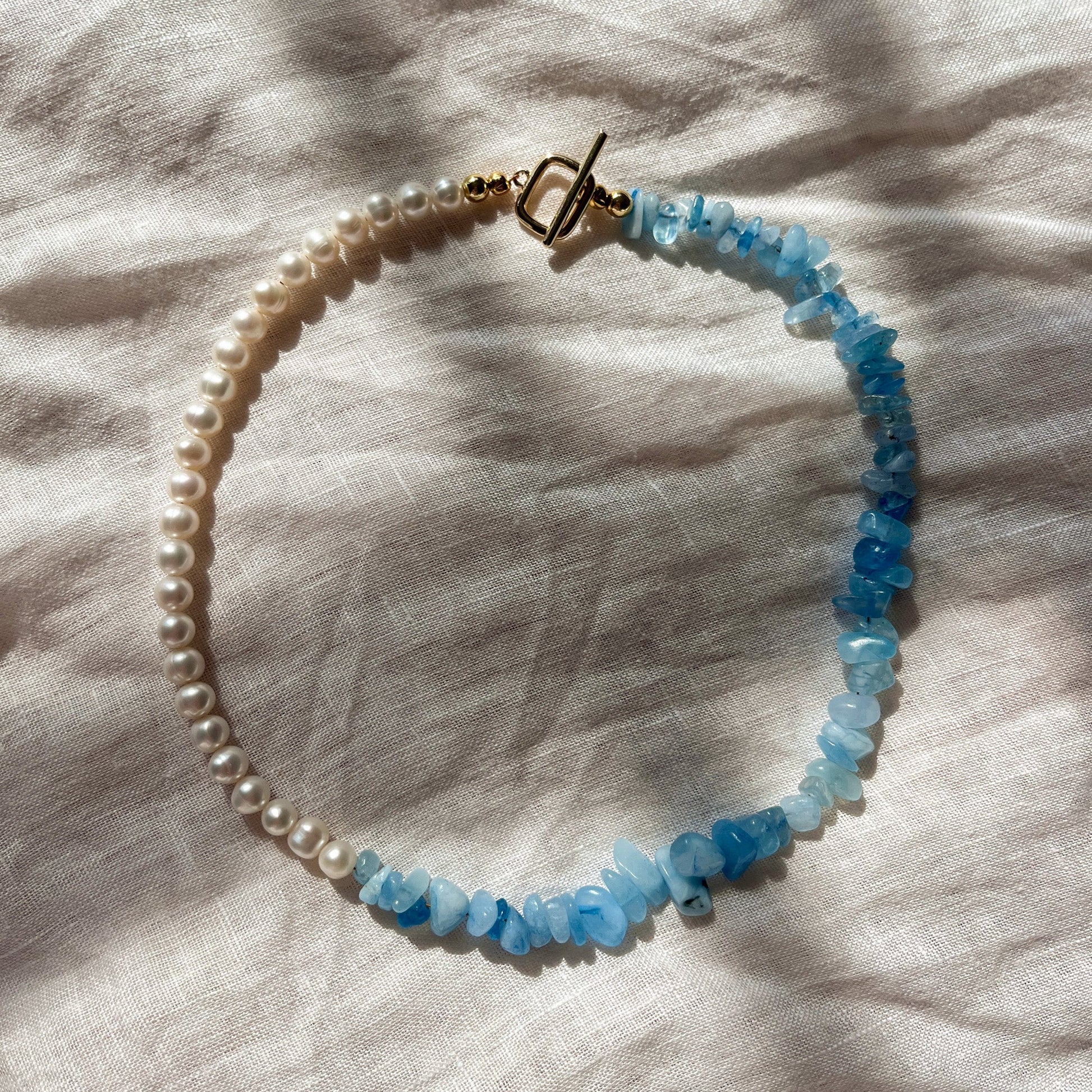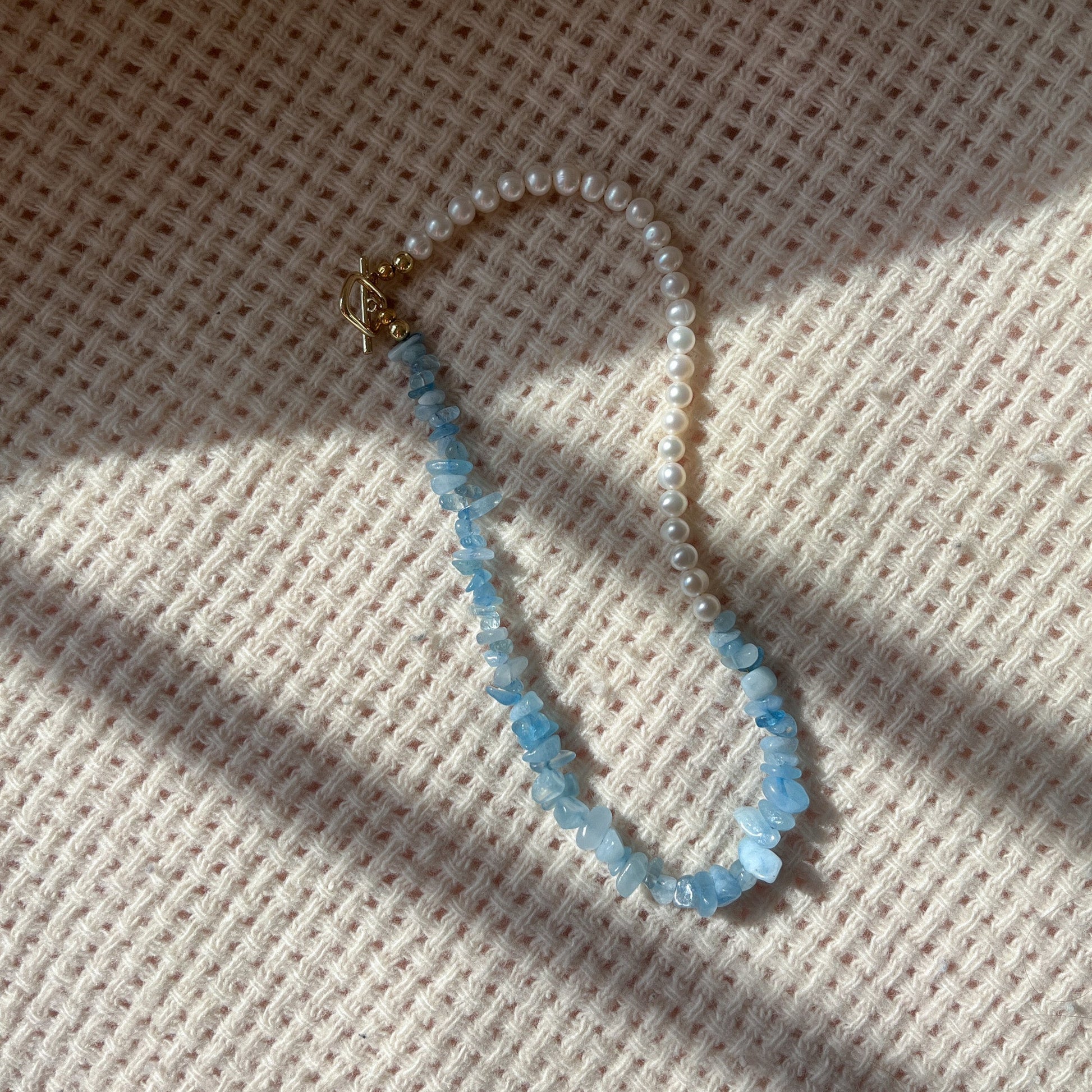 Like a misty morning walk by the ocean. This necklace pairs cool aquamarine chips with classic freshwater pearls — a calm, light and easy-to-wear combination.