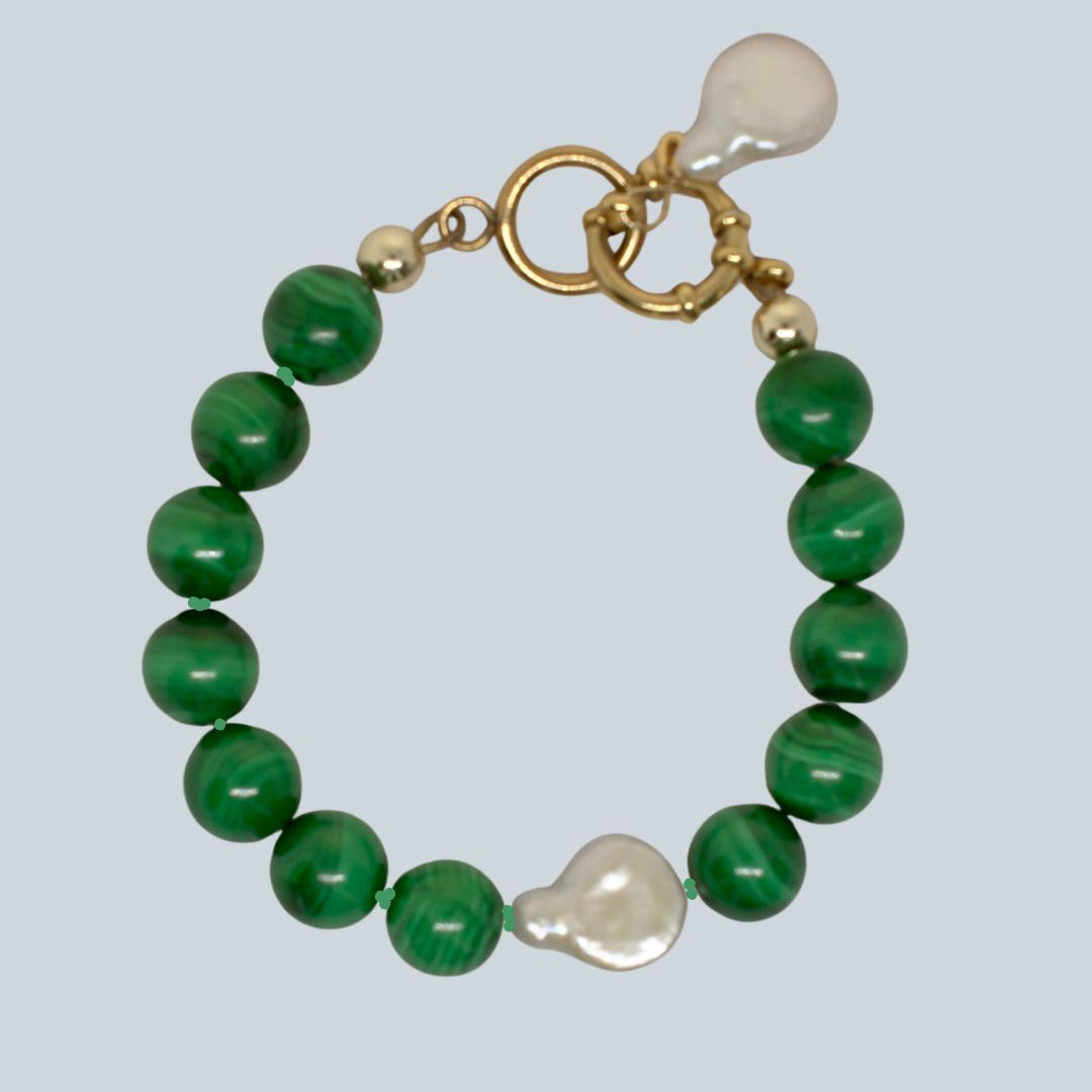 This bracelet pairs malachite, the deep green stone of transformation, with the soft luminosity of pearl, a symbol of wisdom born from patience.